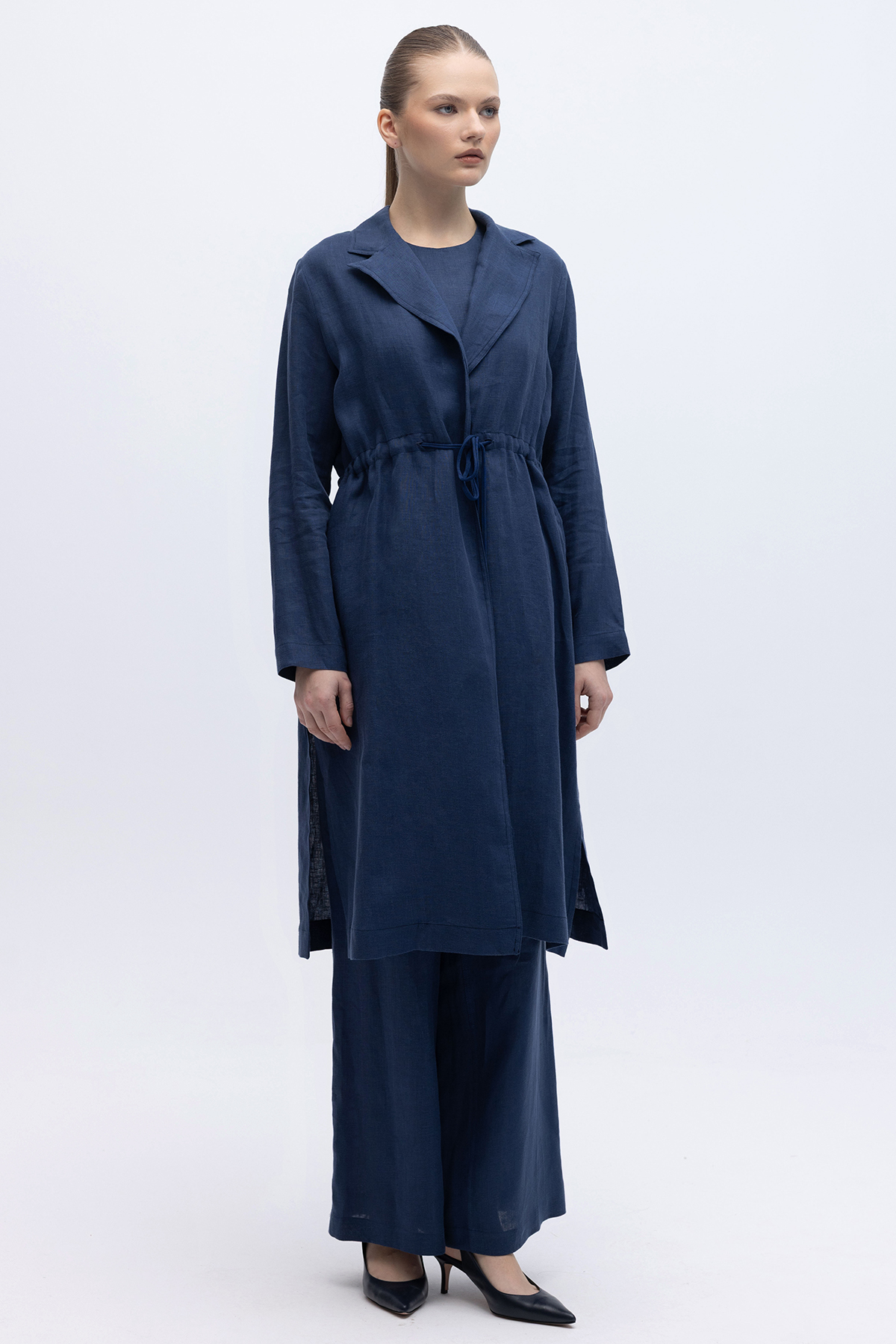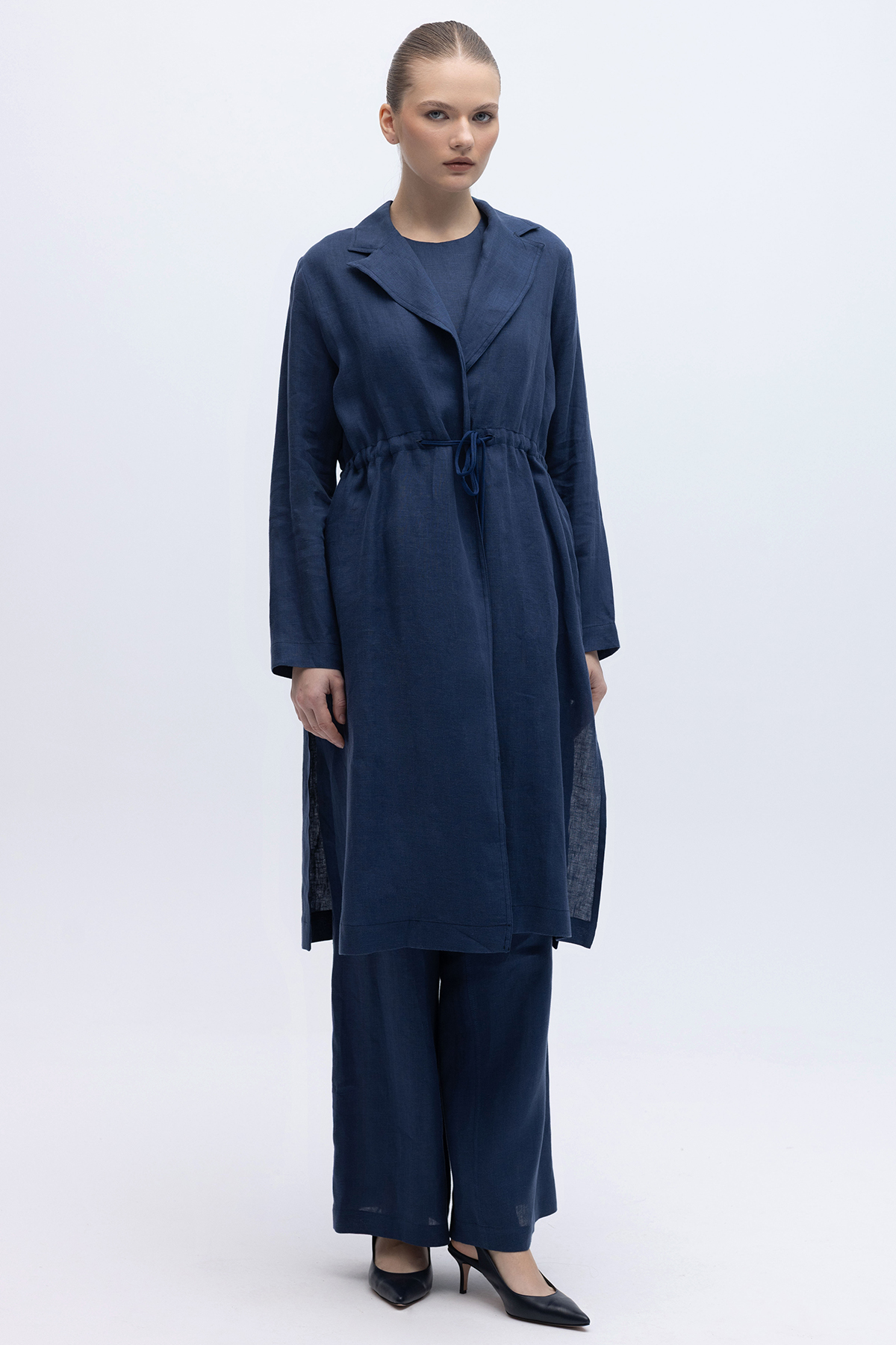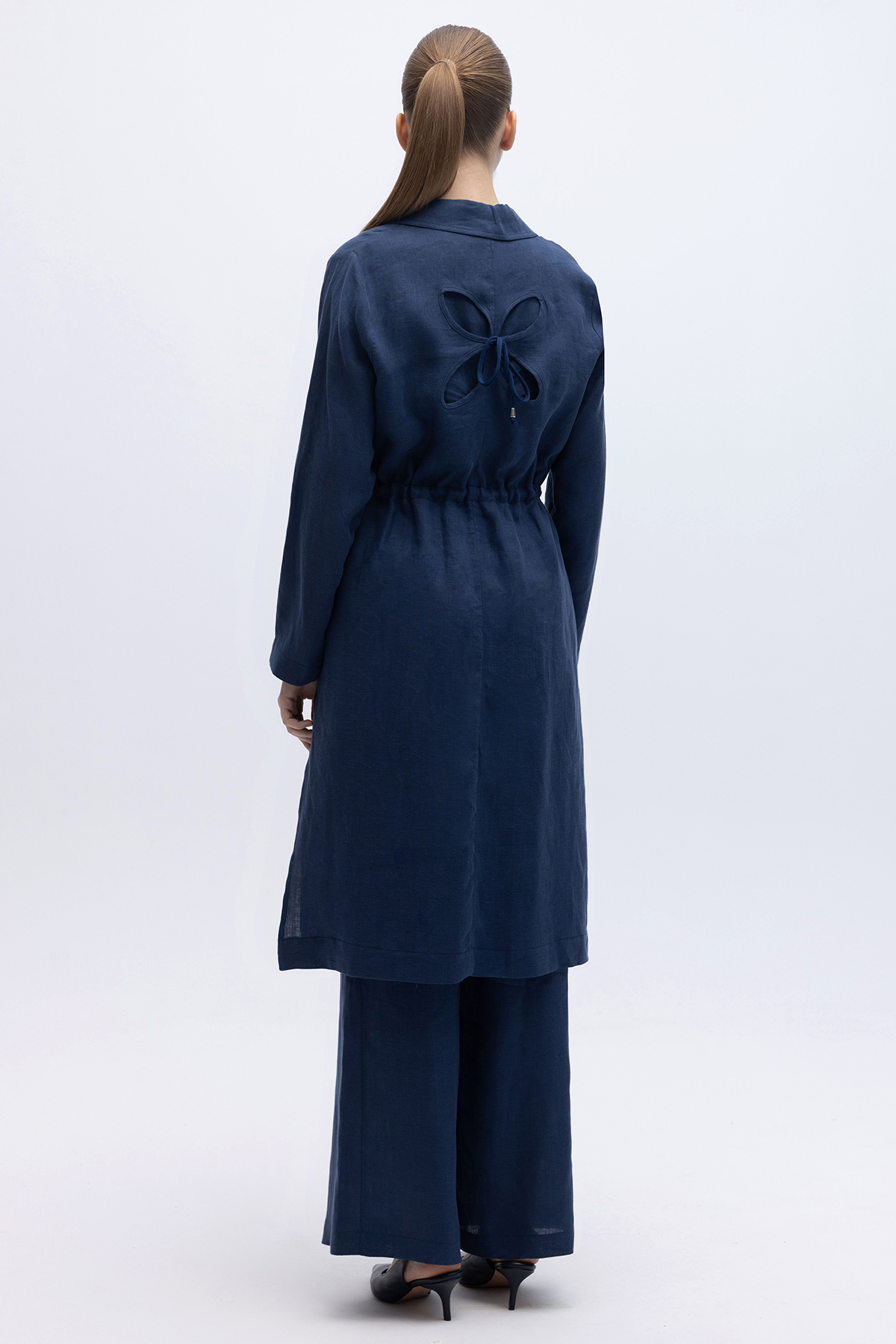 Sırt Detaylı Beli Büzgülü Keten Ceket Navy