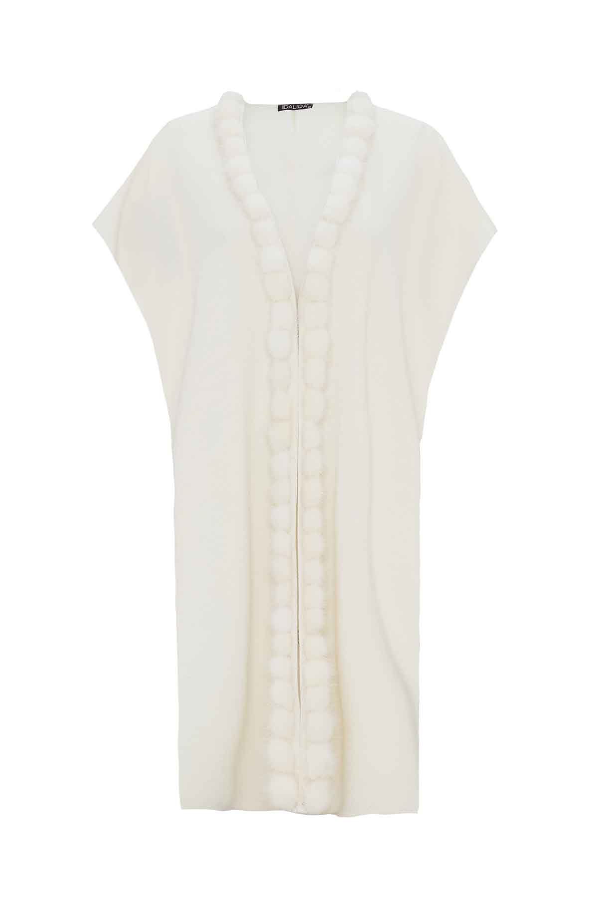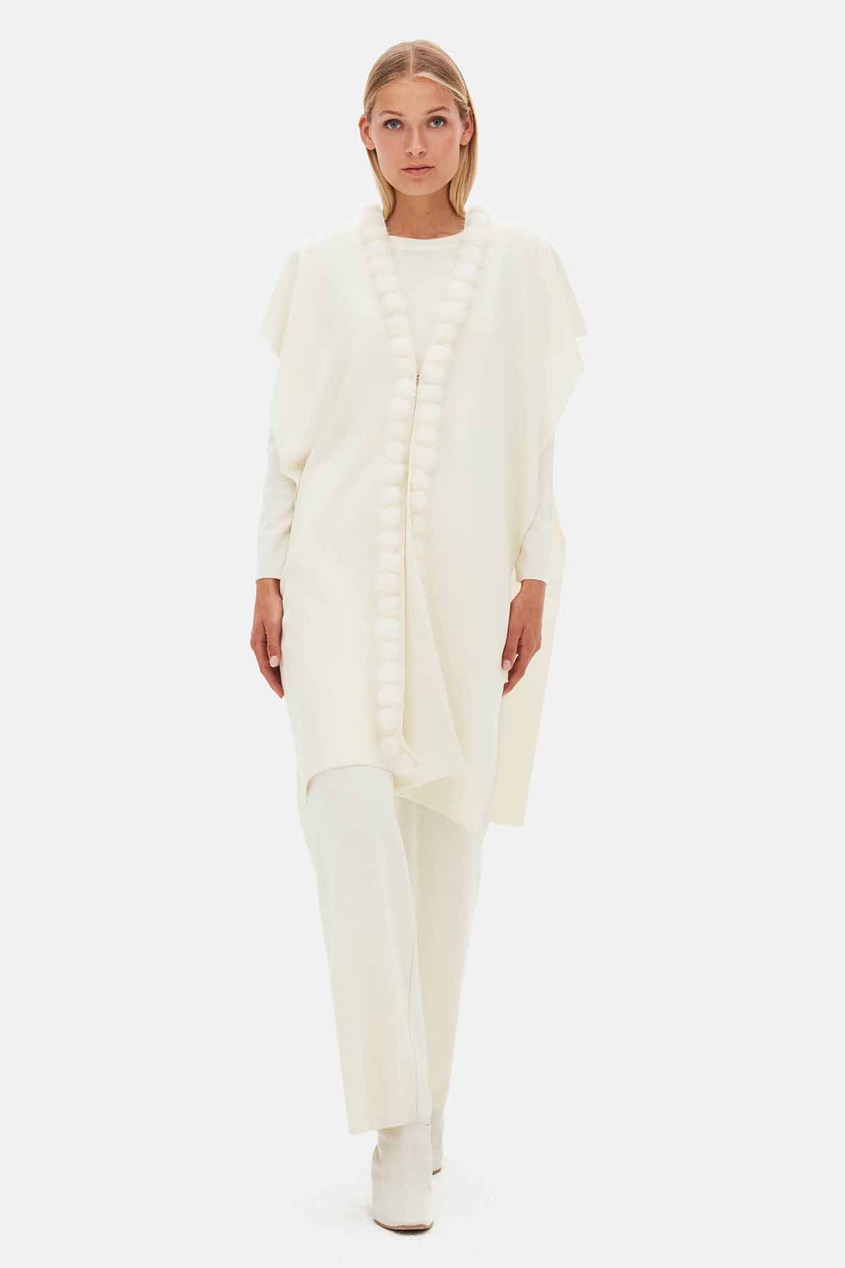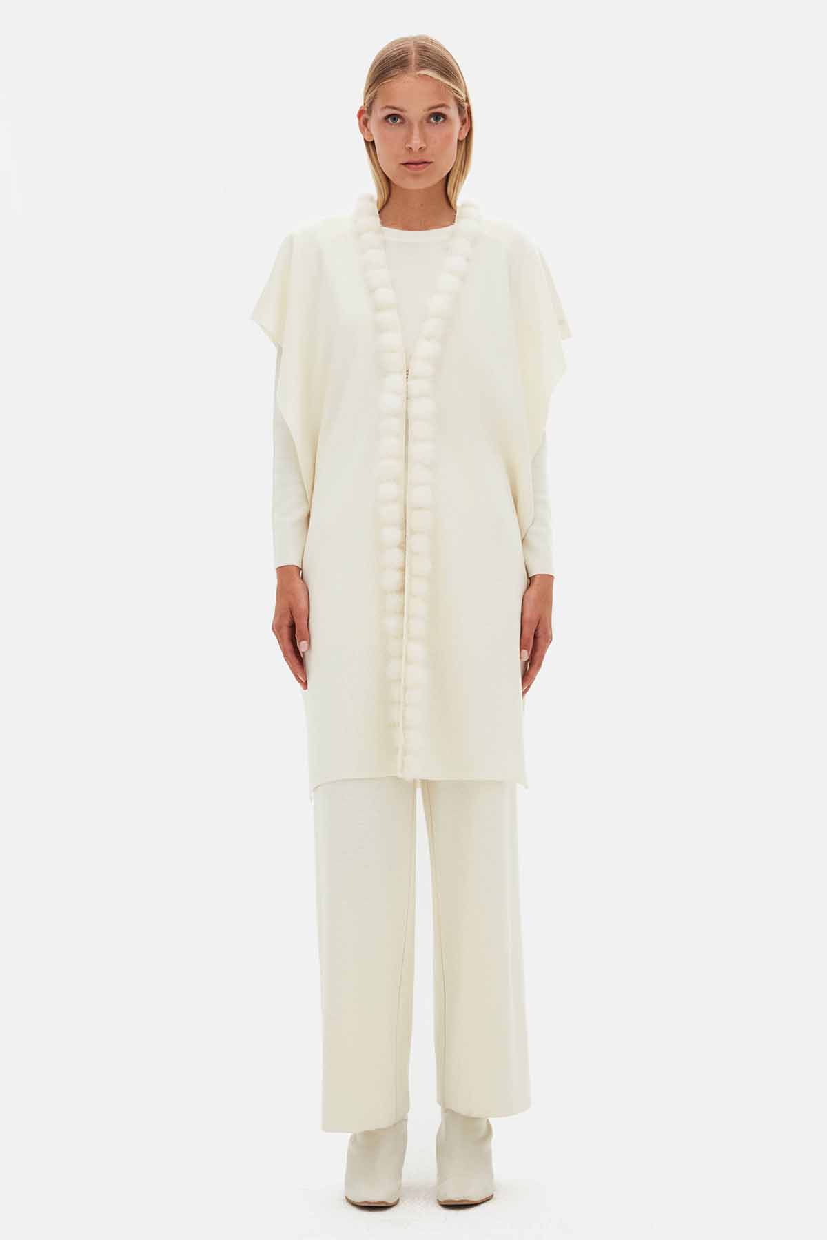 The Sleeveless Knit Coat with Fur Pom-Pom Detail in Ecru features charming pom-pom accents and soft knit fabric. Its sleeveless design allows easy movement, while the elegant ecru shade adds sophistication to any outfit. Perfect for daily wear, combining style and comfort effortlessly.