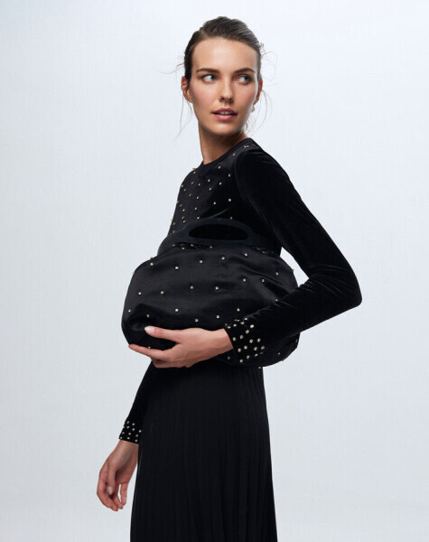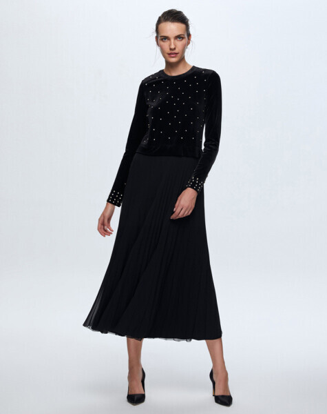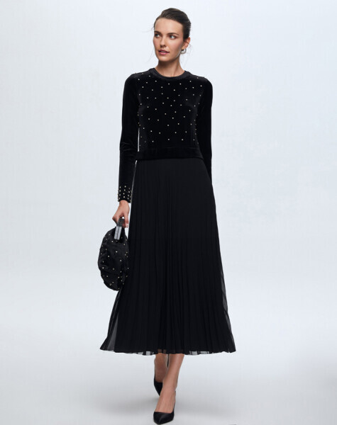 T25K-4012 Yırtmacı Taş Detaylı Elbise BLACK