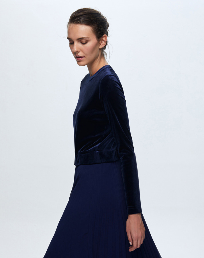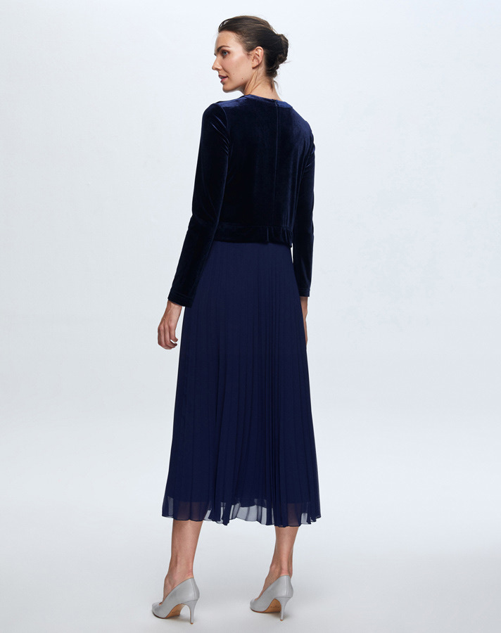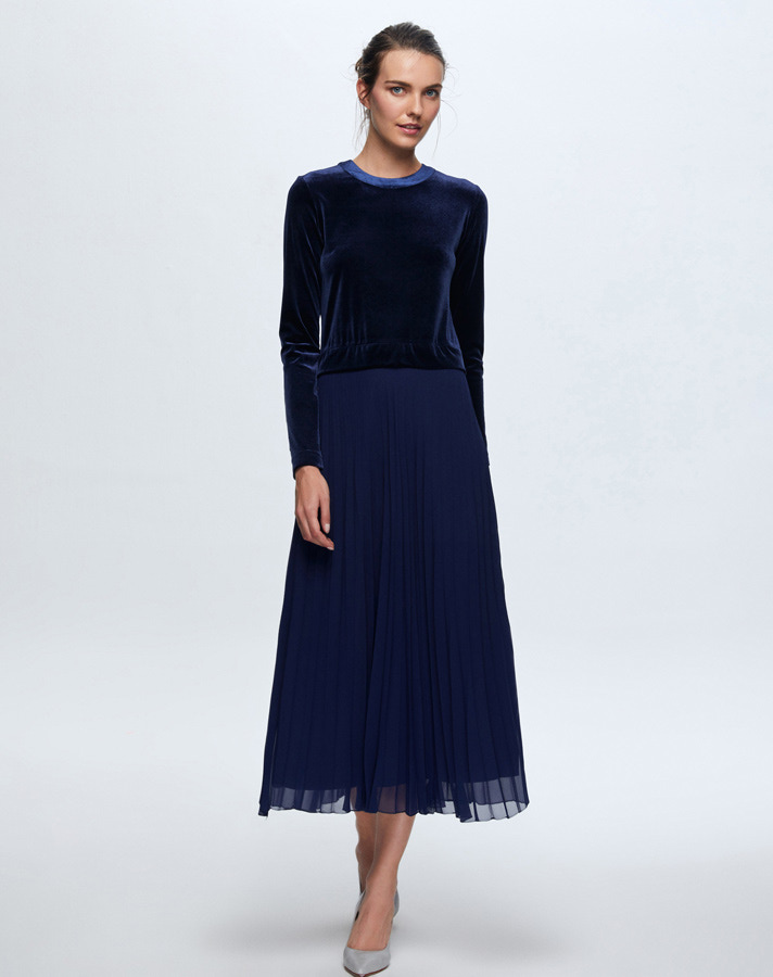 T24K-4007 Kadife-Şifon Pliseli Elbise PETROL
