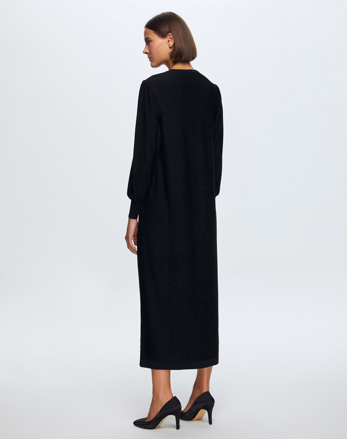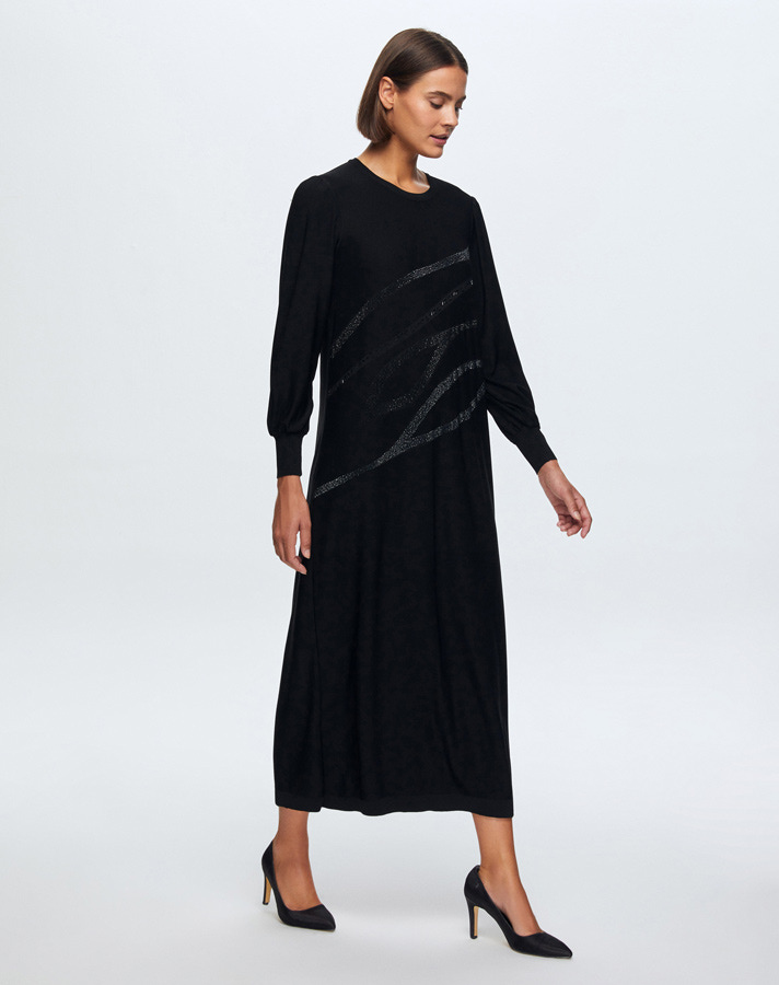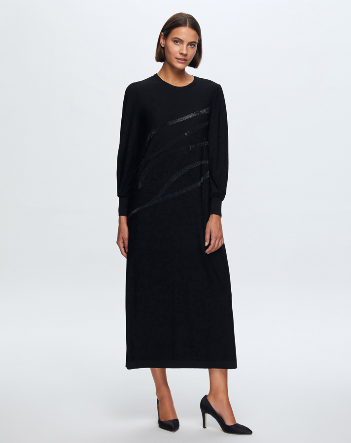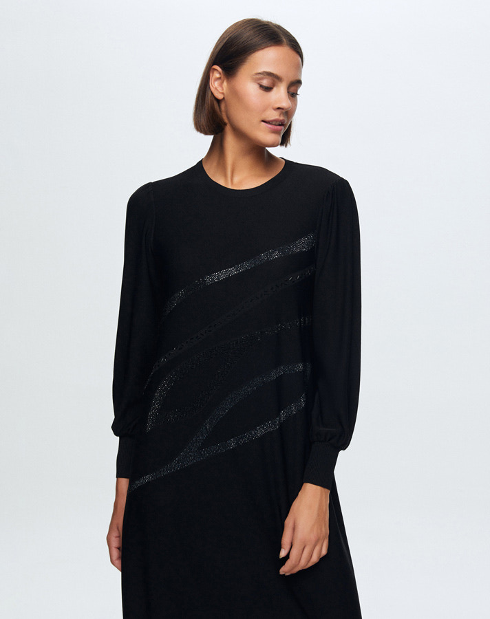 T24K-4012 Balon Kollu Parlak Taşlı Elbise BLACK