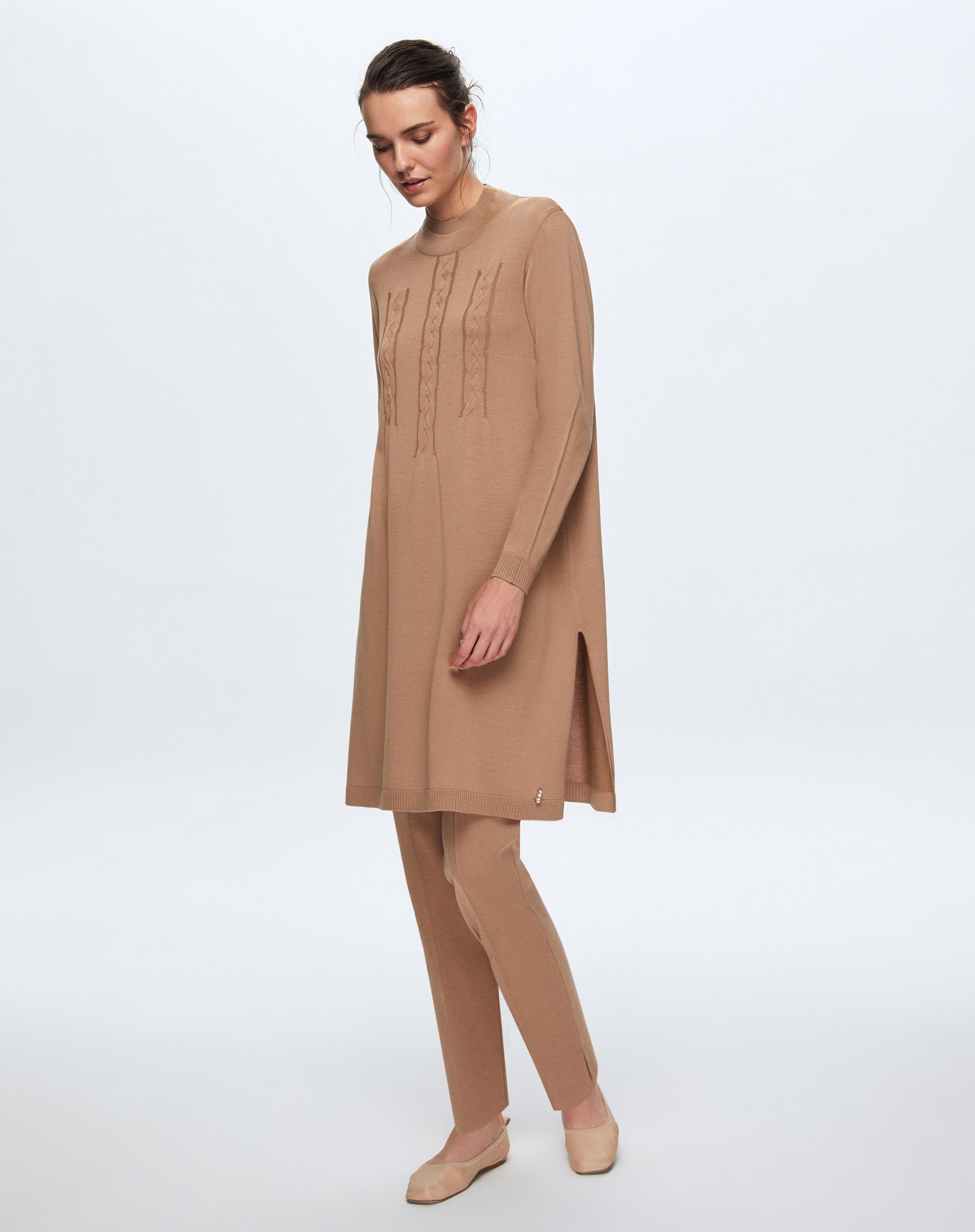 T24K-6030 Saç Örgü Detaylı Tunik COMO-CAREMEL
