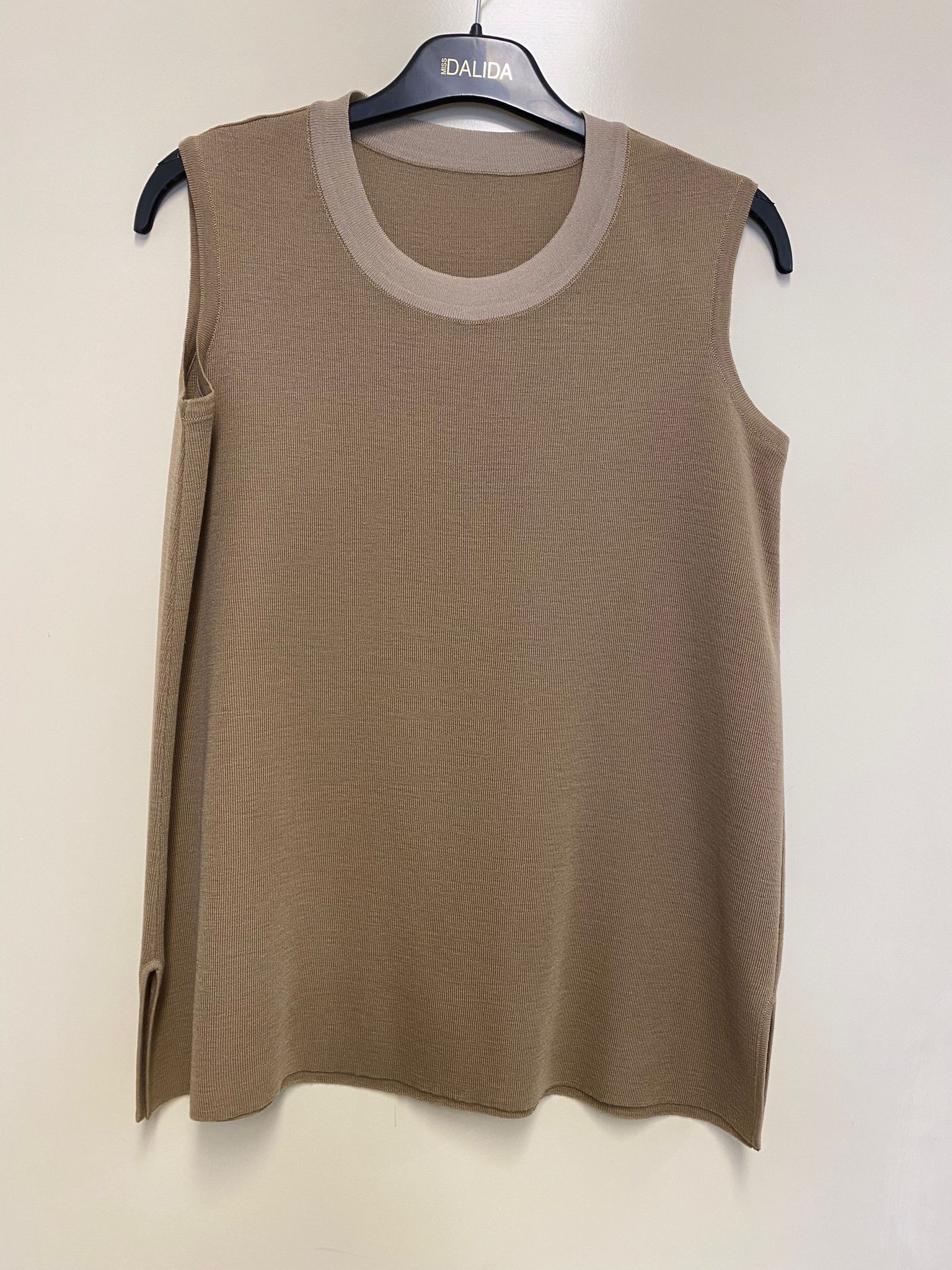 T24K-6041 Yakası Renkli Kolsuz Triko Tunik CORO-CAMEL