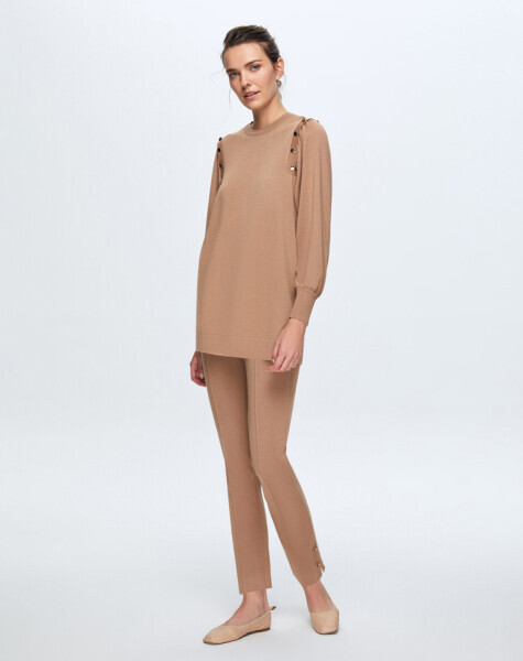 T24K-7010 Paçası Düğme Detaylı Triko Pantolon COMO-CAREMEL