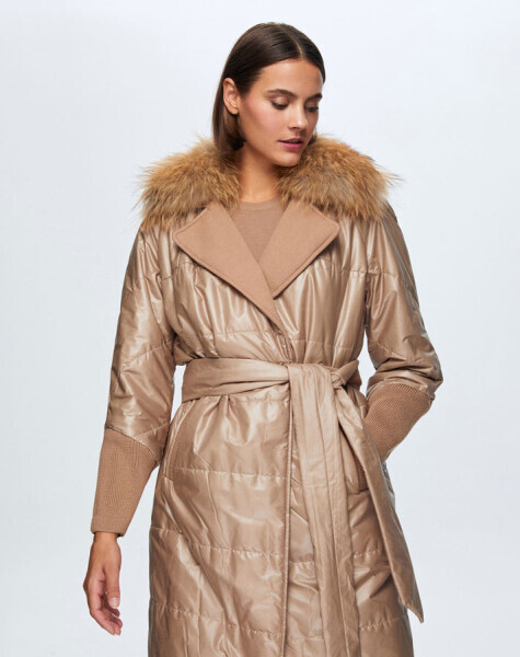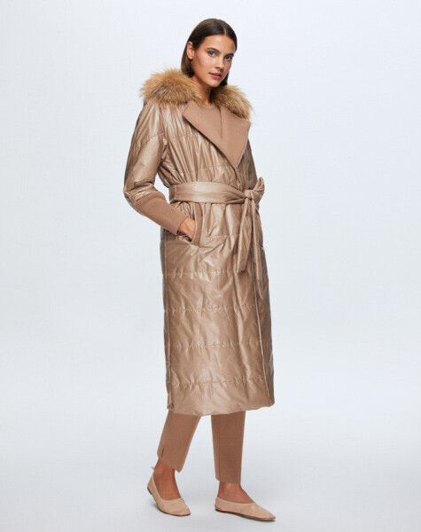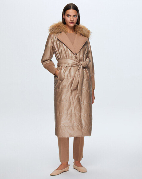 T24K-8021 Askı Detaylı Kürklü Uzun Mont CARAMEL