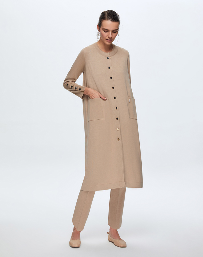T24K-9022 Düz Renk Düğmeli Uzun Hırka CORO-CAMEL