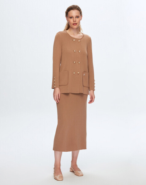 Yuvarlak Yaka Düğme Detaylı Kahverengi Hırka