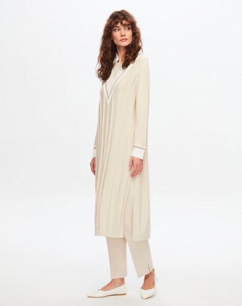 T24Y-4020 V Yaka Saç Örgü Detaylı Elbise 1245-STONE