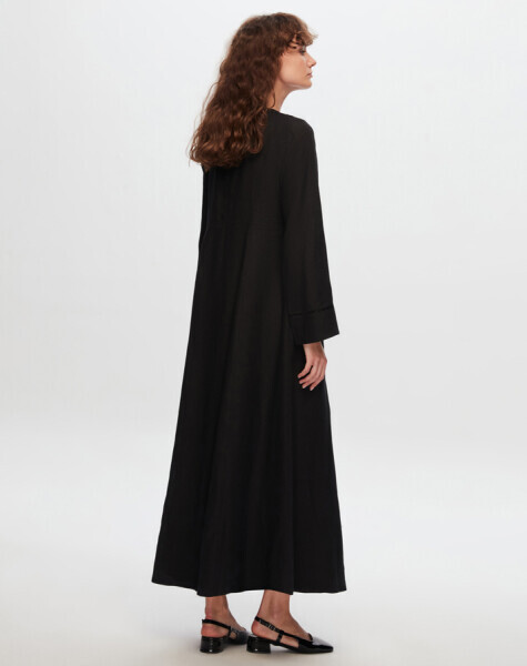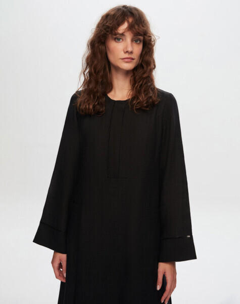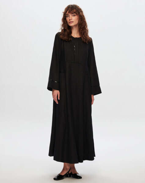 T24Y-4027 Pul Detaylı A Kesim Keten Elbise BLACK