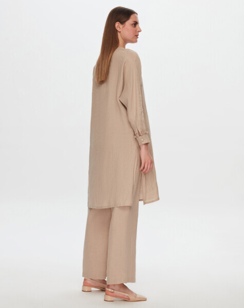 T24Y-6034 Yakası Fırfır Detaylı Keten Tunik BEİGE