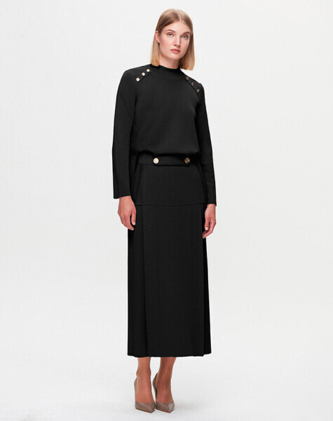 T25K-2008 A Kesim Düğme Detaylı Etek BLACK