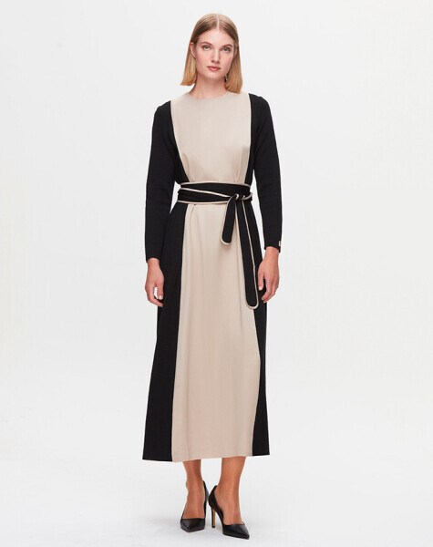 T25K-4005 Beli Kuşaklı Cupro Detaylı Elbise BLACK