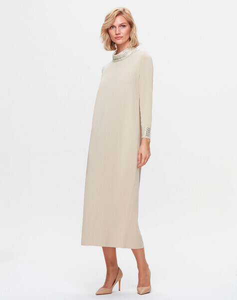 T25K-4008 Yakası ve Bileği Taş Detaylı Elbise DIDO-BEİGE