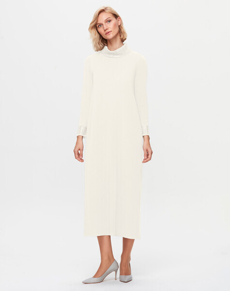 T25K-4008 Yakası ve Bileği Taş Detaylı Elbise FEDE-ECRU
