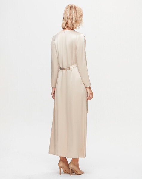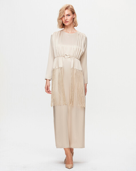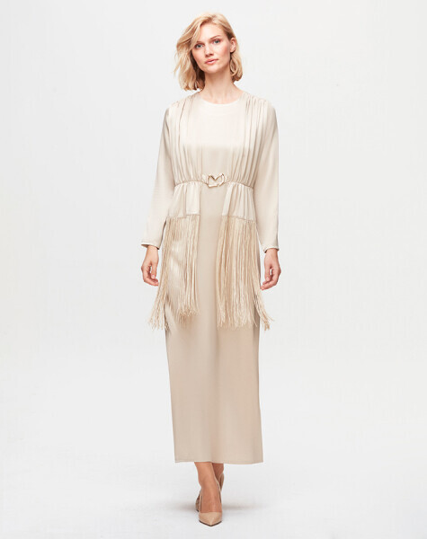 T25K-4009 Püskül Detaylı Parlak Kumaş Elbise BEİGE
