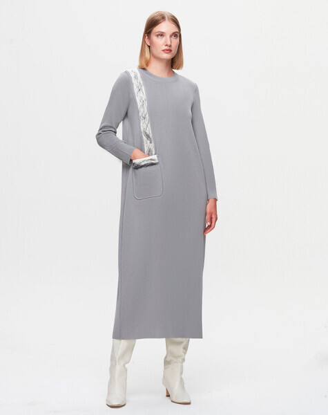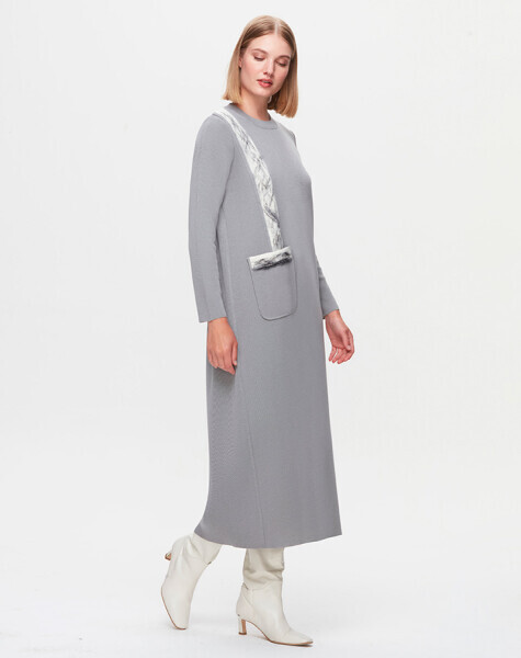 T25K-4011 Cebi ve Önü Keçe Detaylı Elbise VİALE-GREY