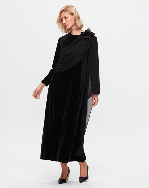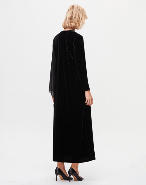 T25K-4013 Tül Detaylı Kadife Şık Elbise BLACK
