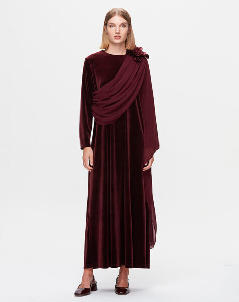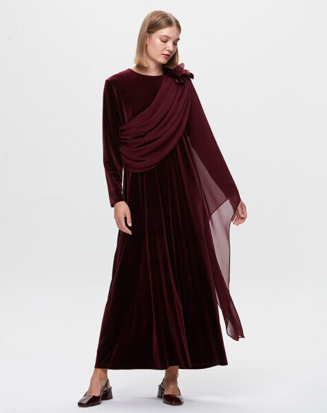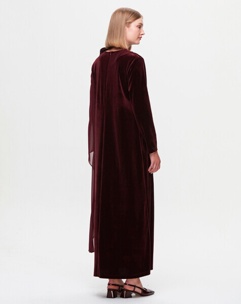 T25K-4013 Tül Detaylı Kadife Şık Elbise OUBERGINE