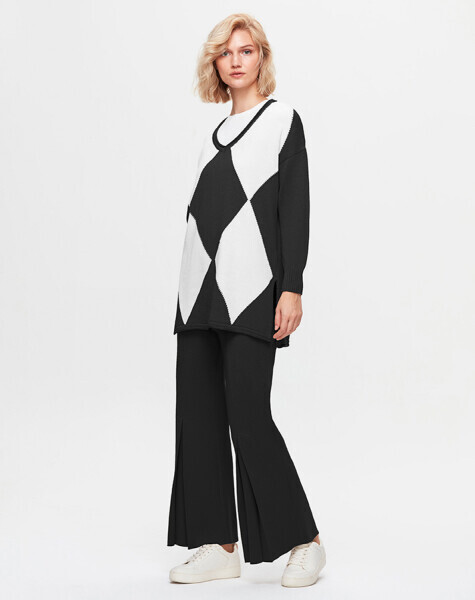 T25K-7014 Önü İspanyolon Kesim Bol Paça Siyah Pantolon