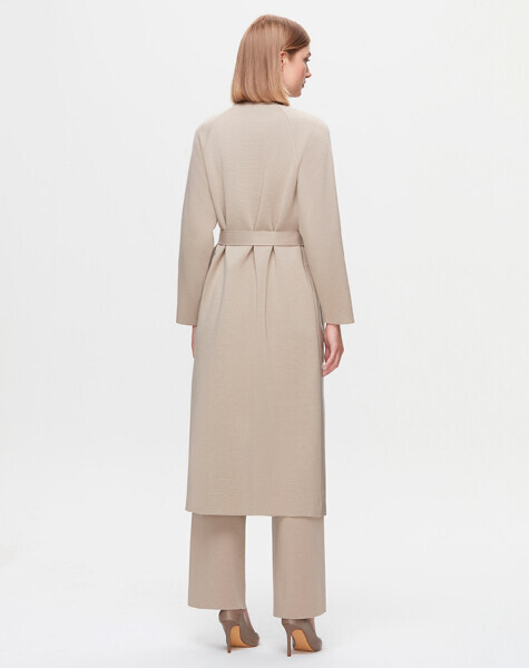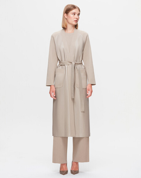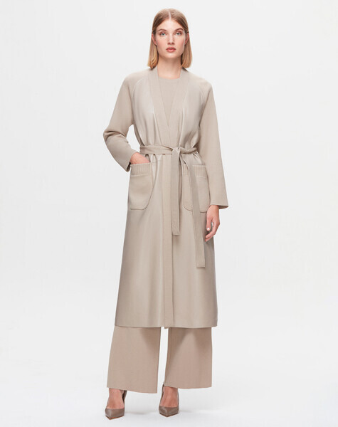 T25K-8011 Önü Deri Kuşaklı Uzun Ceket 8YR71-STONE