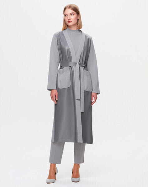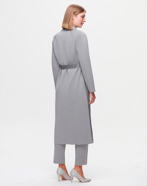T25K-8011 Önü Deri Kuşaklı Uzun Ceket VİALE-GREY