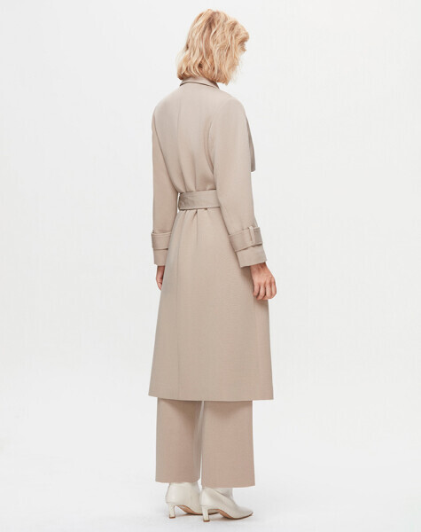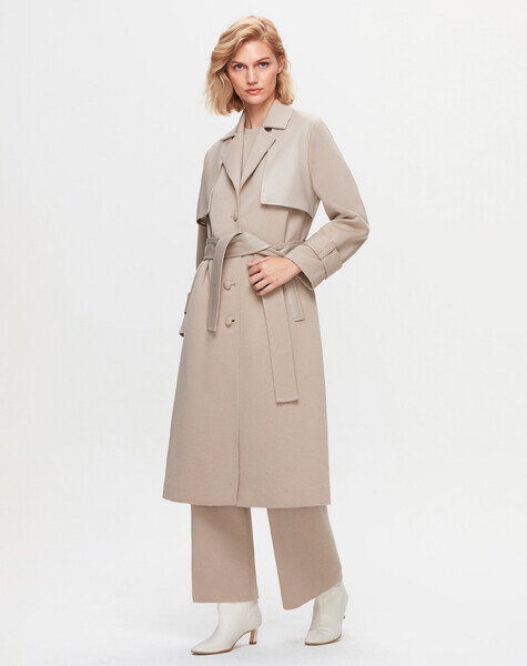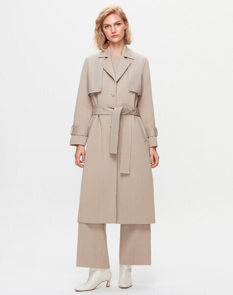 T25K-8011 Önü Deri Kuşaklı Uzun Ceket 8YR71-STONE