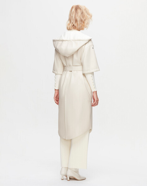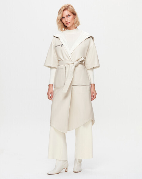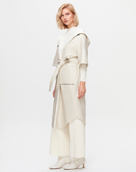 T25K-8011 Önü Deri Kuşaklı Uzun Ceket 8YR71-STONE