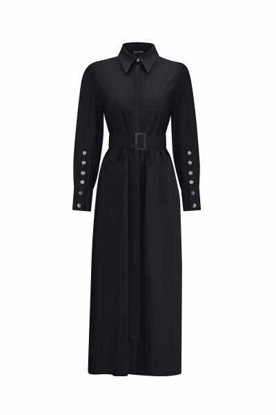 T25PF-4008 Gömlek Yaka Cepli Kumaş Elbise BLACK
