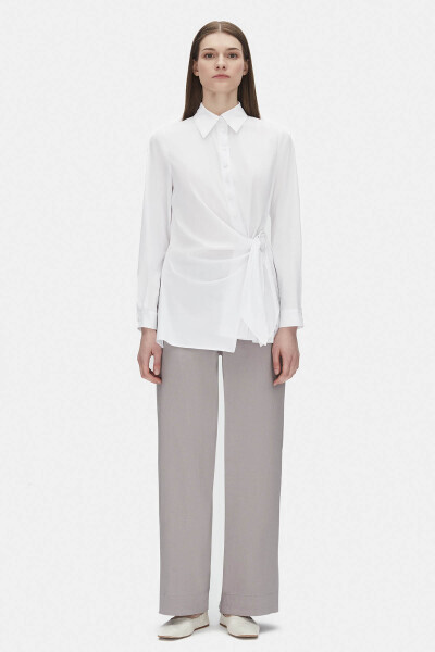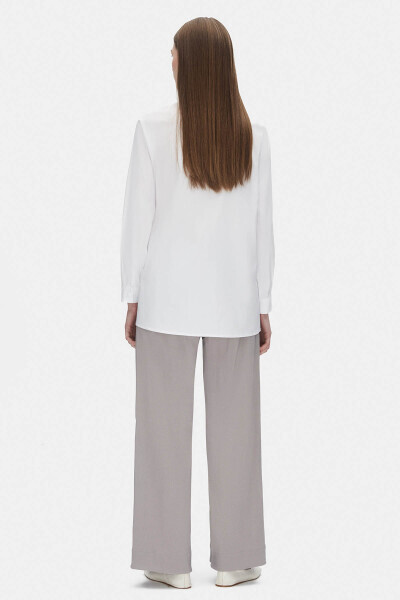 Rahat kesimi ve dökümlü yapısıyla hem konforlu hem de şık bir duruş sunan bol paça kumaş pantolon, gardırobunuzun joker parçalarından biri olmaya aday. Hafif ve akıcı kumaşı sayesinde gün boyu serinlik sağlarken, yüksek bel detayıyla vücut proporsiyonunu dengeler. Gömlek, bluz ya da tuniklerle kolayca kombinlenebilir, hem günlük hem ofis stiline uyum sağlar.