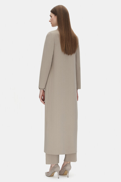 Zarif yırtmaç detaylarıyla hareket kazanan bu uzun triko hırka, minimal tasarımıyla modern bir duruş sergiler. Günlük kombinlerinize şıklık katarken, yumuşak ve esnek dokusuyla konfor sunar. Mevsim geçişlerinde ve serin günlerde ideal bir tamamlayıcıdır.