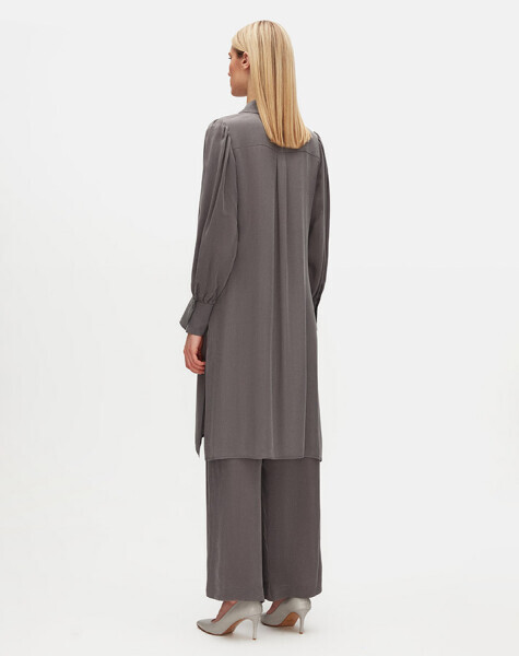 İpeksi dokulu vegan cupro kumaşıyla öne çıkan bu gömlek, bebe yaka ve balon kol detaylarıyla feminen ve zarif bir silüet sunar. Önden tam düğmeli yapısı sayesinde ister tek başına ister katmanlı görünümlerde rahatlıkla kullanılabilir.