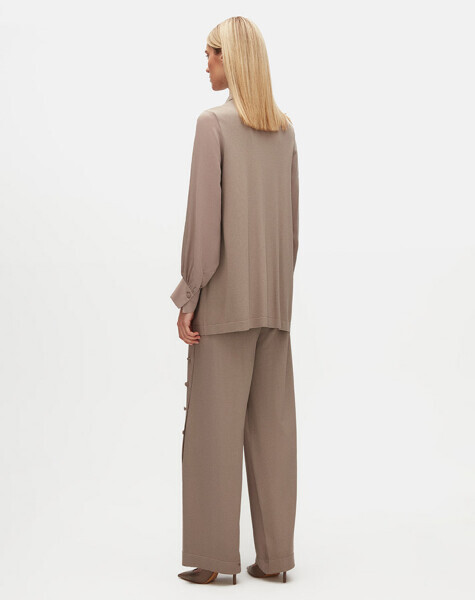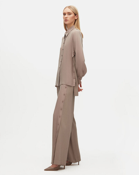 İpeksi dokulu vegan cupro kumaştan üretilen bu gömlek, önden düğme detaylarıyla klasik şıklığı modern bir yorumla sunar. Hafif yapısı sayesinde gün boyu konfor sağlarken, sade formu gardırobunuzun vazgeçilmezlerinden olmaya aday.