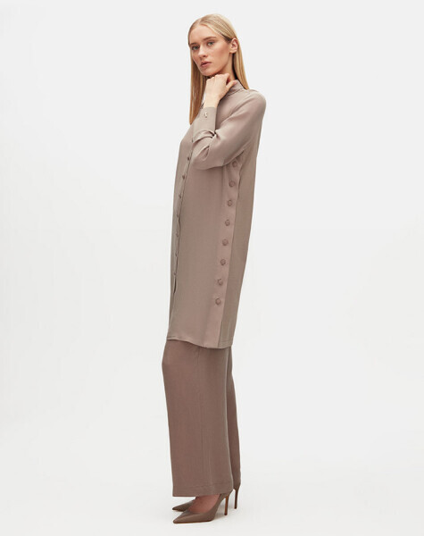 İpeksi dokulu vegan cupro kumaştan tasarlanan bu uzun gömlek, ön ve yan kısmındaki düğmelerle dinamik bir görünüm sunar. Manşetlerde yer alan üçlü Swarovski taş detayı ise şıklığı sofistike bir dokunuşla tamamlar.