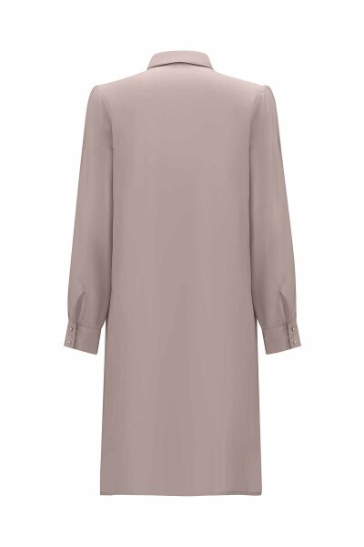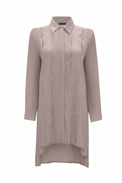 İpeksi dokulu vegan cupro kumaştan üretilen bu gömlek, önden gizli düğmeli yapısıyla sade ve temiz bir silüet sunar. Yaka kısmındaki taşlı aksesuar detayı ise tasarıma sofistike bir ışıltı katarken, tüm bakışları üzerine çeker.