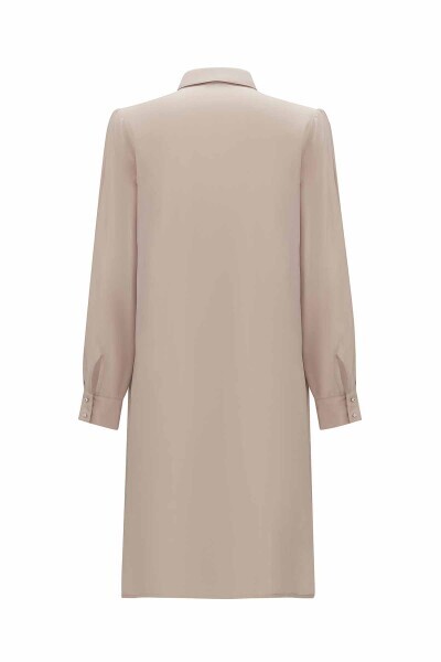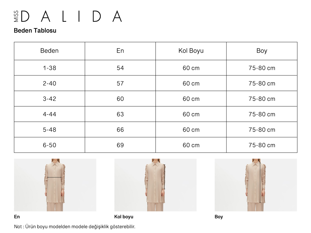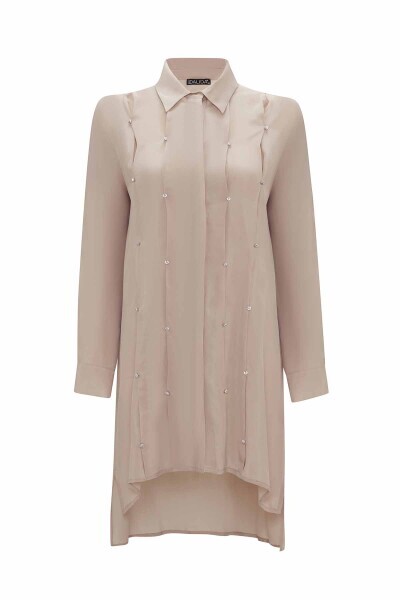 İpeksi dokulu vegan cupro kumaştan üretilen bu gömlek, önden gizli düğmeli yapısıyla sade ve temiz bir silüet sunar. Yaka kısmındaki taşlı aksesuar detayı ise tasarıma sofistike bir ışıltı katarken, tüm bakışları üzerine çeker.