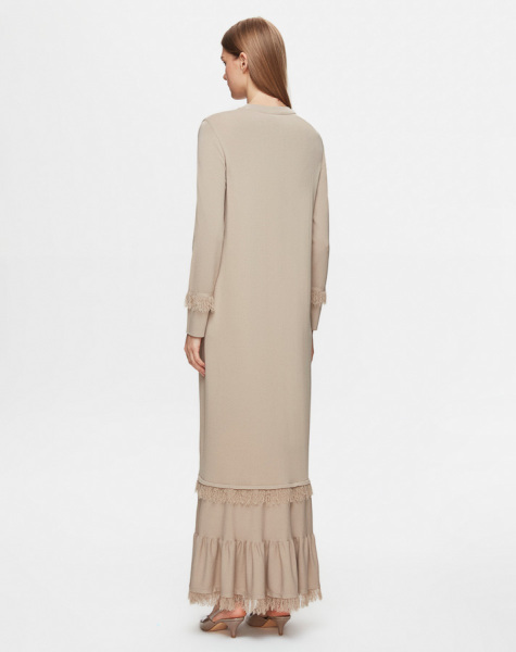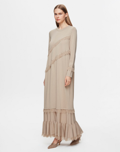 Püskül Detaylı Triko Uzun Taş Rengi Elbise