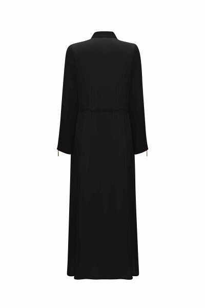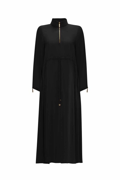 İpeksi dokulu vegan cupro kumaştan üretilen bu uzun kollu elbise, önden fermuar kapamasıyla pratik bir kullanım sunarken