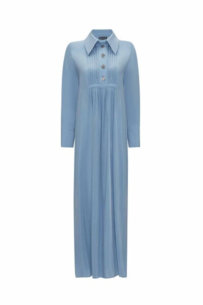 Gömlek Yaka Nervürlü Cupro Mavi Elbise