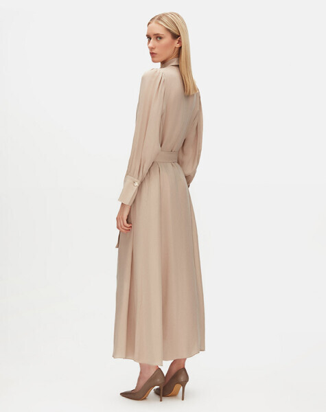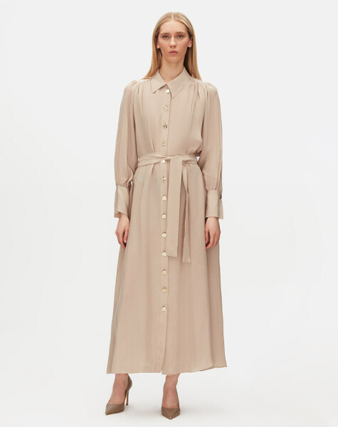 T25Y-4020 Düğme Detaylı Kuşaklı Gömlek Yaka Elbise STONE