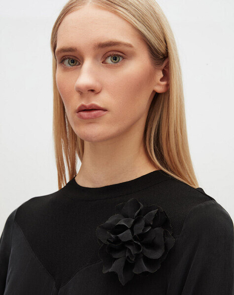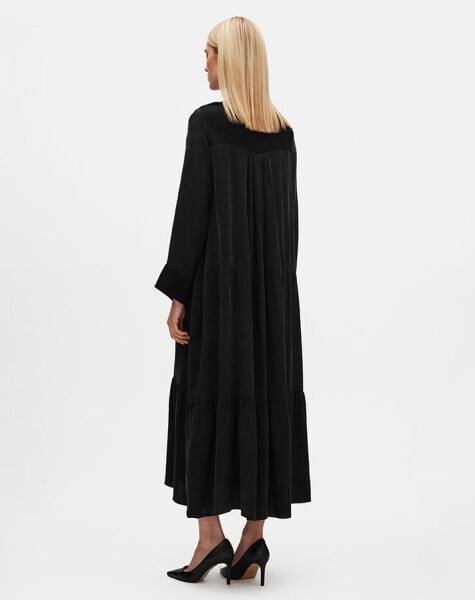 Minimalist zarafetin simgesi olan bu elbise, yumuşak dokulu cupro kumaşı ile hem doğal hem de asil bir duruş sunuyor. Göğüs kısmında yer alan ton-sür-ton çiçek broş detayı feminen bir dokunuş katarken, bisiklet yaka kesimi ve rahat kalıbı ile gün boyu konfor sağlıyor. Volanlı etek kesimi elbiseye hareket katarken, özel günlerden günlük şıklığa kadar geniş bir kullanım alanı sunar.