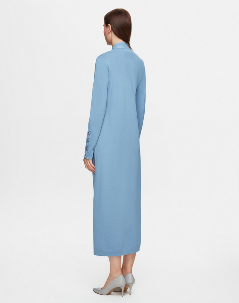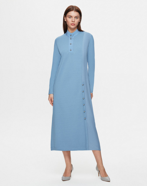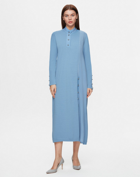 Dik Yaka Düğme Detaylı Mavi Elbise