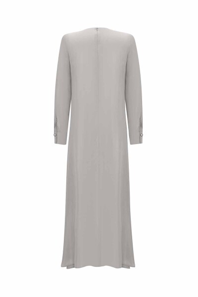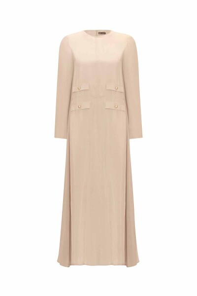 İpeksi ve vegan cupro kumaştan üretilen bu elbise, ön kısmındaki dört kapaklı cep detayı ve zarif düğme aksesuarlarıyla dikkat çeker. Hem işlevsel hem estetik olan bu detaylar, elbiseye güçlü bir duruş kazandırırken sade tasarımı tamamlar. Akıcı formu ve hafif dokusuyla gün boyu konfor sağlar.