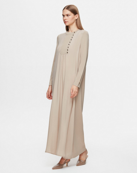 Yakası Düğme ve Nervür Detaylı Cupro Triko Taş Renk Elbise