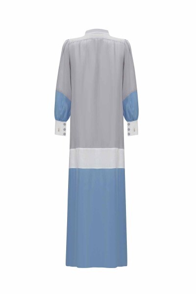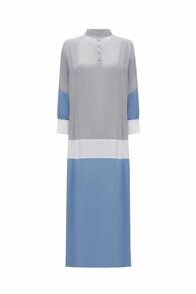 Keten Detaylı Dik Yaka Cupro Gri Mavi Elbise