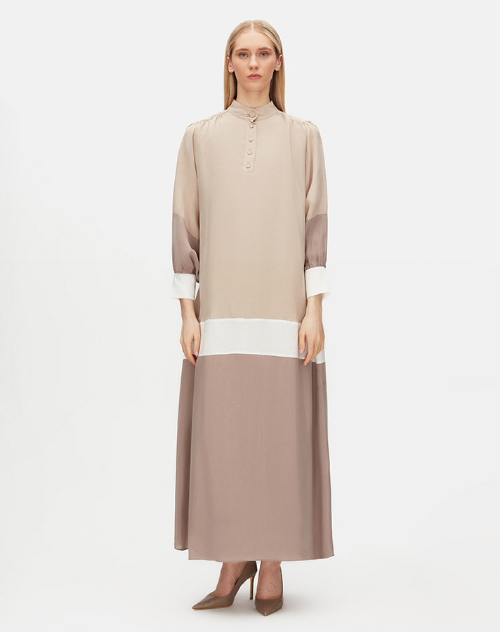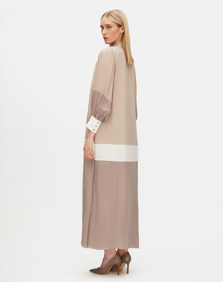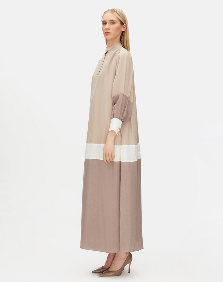 T25Y-4048 Keten Detaylı Dik Yaka Cupro Elbise STONE / BLACK
