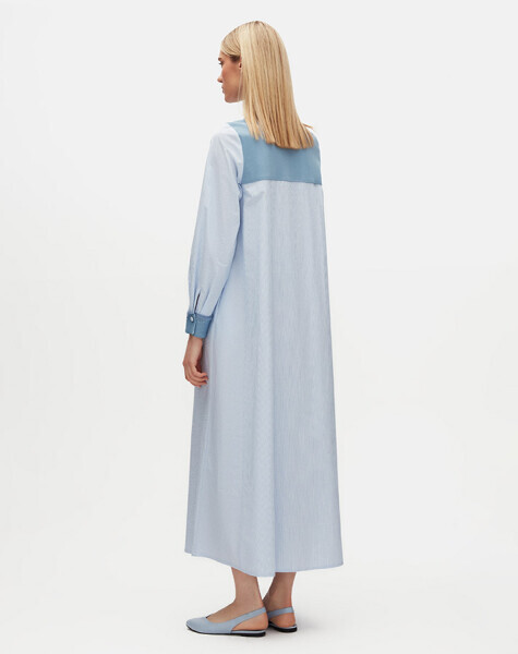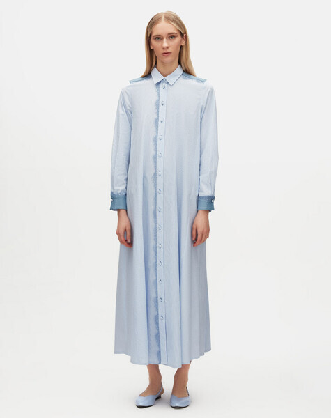 Uzun kollu ve önden düğmeli bu elbise, gömlek formuna modern bir yorum getiriyor. Tül ve triko detaylarla zenginleşen tasarım