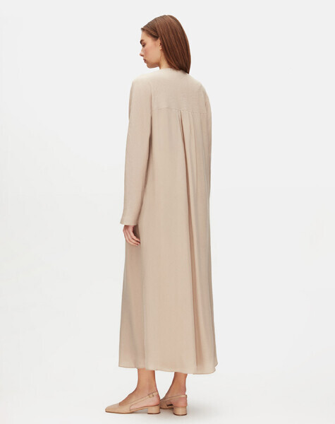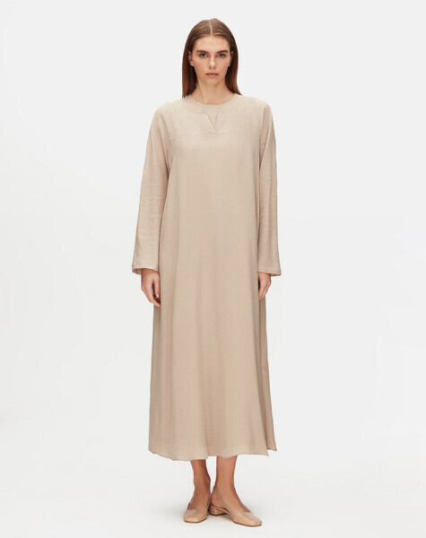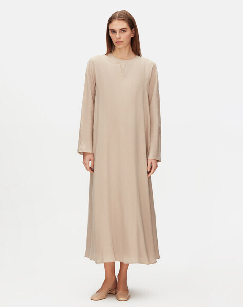 Bisiklet yaka formu ve uzun kollu yapısıyla konforlu bir kullanım sunan bu elbise, cupro kumaşın ipeksi dokusunu keten detaylarla buluşturuyor. Rahat kesimi sayesinde gün boyu hareket özgürlüğü sağlarken, doğal görünümüyle sade ve zamansız bir stil sunar.