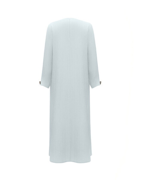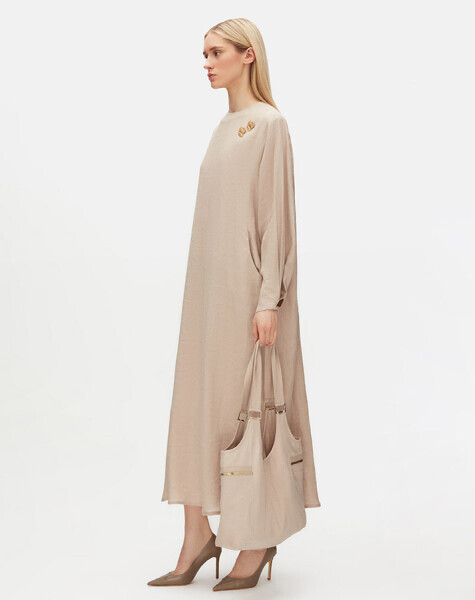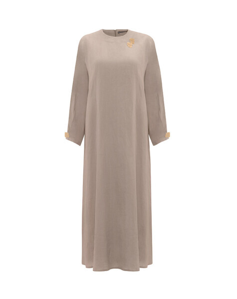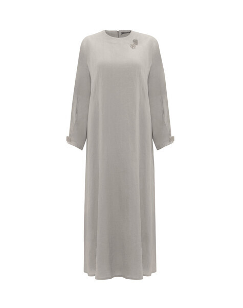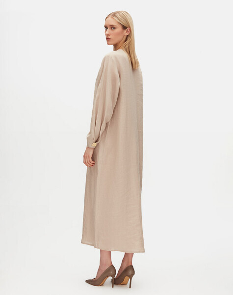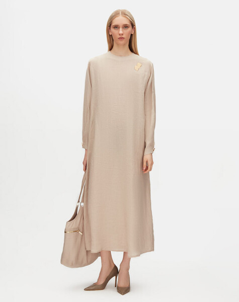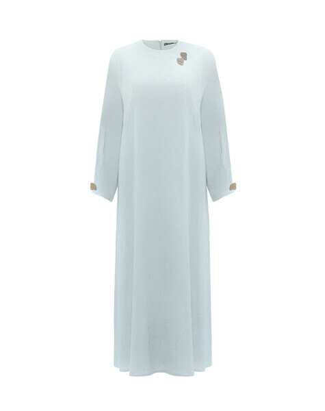 Uzun kollu ve düz renkli tasarımıyla sade şıklığı temsil eden bu keten elbise, omuz kısmındaki aksesuar detayıyla modern bir hava kazanıyor. Nefes alabilen kumaşı sayesinde yaz aylarında rahatlıkla tercih edilebilir. Minimal stilinize iddialı bir dokunuş katar.