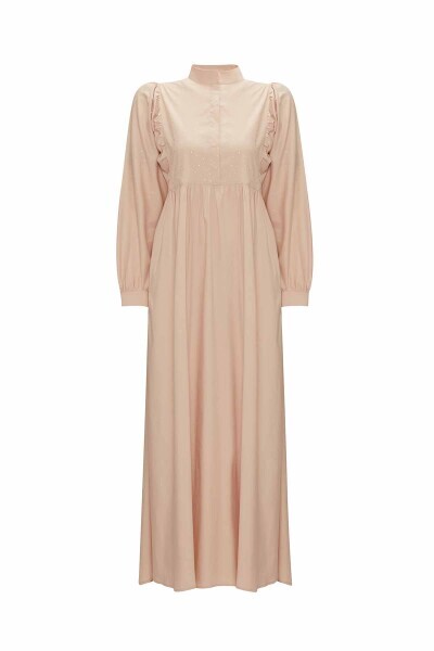 T25Y-4066 Taş Detaylı Karpuz Kollu Pamuklu Elbise SAND