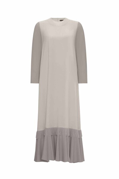 Yumuşak dokulu keten kumaşıyla nefes alabilen bir konfor sunan bu uzun elbise, etek ucundaki püskül detayları ve katmanlı görünümüyle fark yaratıyor. Uzun kolları ve sade formu, minimal bir şıklık arayanlar için ideal.